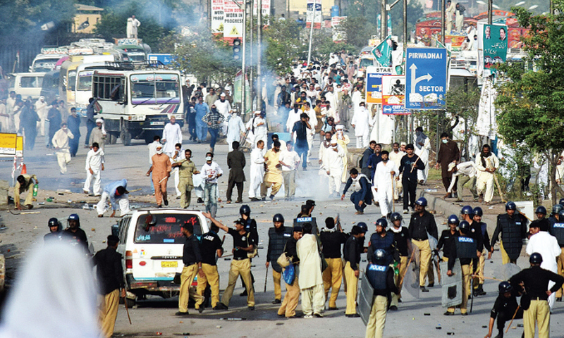 Street battles that had been going on between the police and PAT supporters since dawn had intensified in the meantime. After the politically damaging bloody action in Lahore, police had orders not to use arms and replied PAT activists’ attacks with batons, stones and teargas.